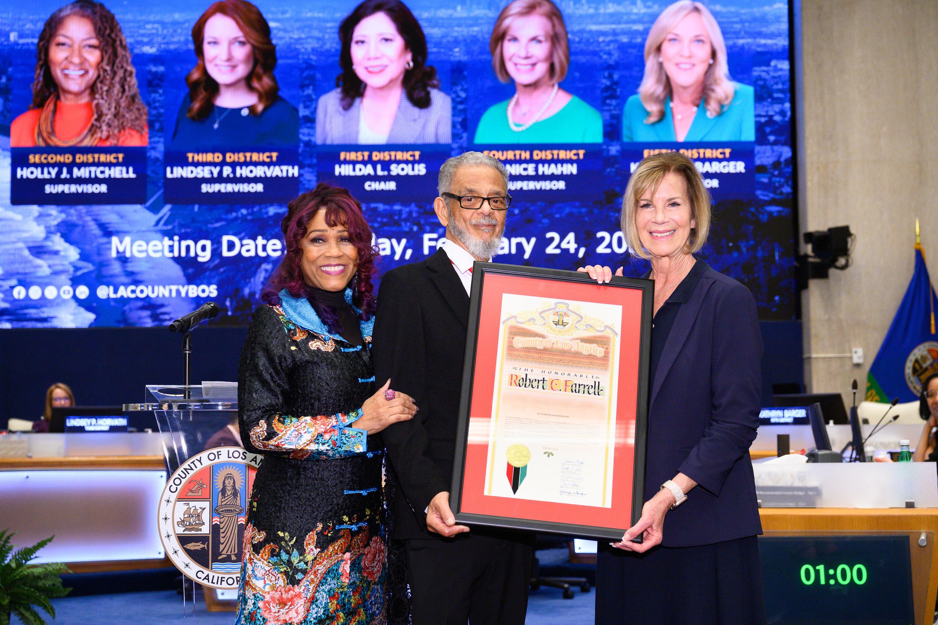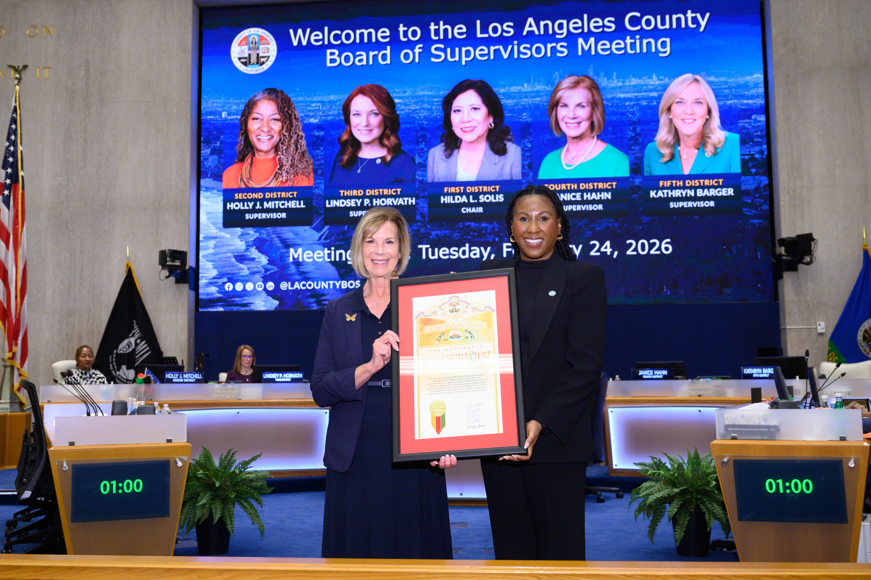 Los Angeles, CA — In celebration of Black History Month, Los Angeles County Supervisor Janice Hahn today honored two local Black civic leaders at the public hearing of the Board of Supervisors, Robert C. Farrell, a former member of the Los Angeles City Council and San Pedro resident who was a Freedom Rider during the Civil Rights movement of the 1960s, and Cassandra Chase who made history in 2025 when she became the first Black mayor of the City of Lakewood.