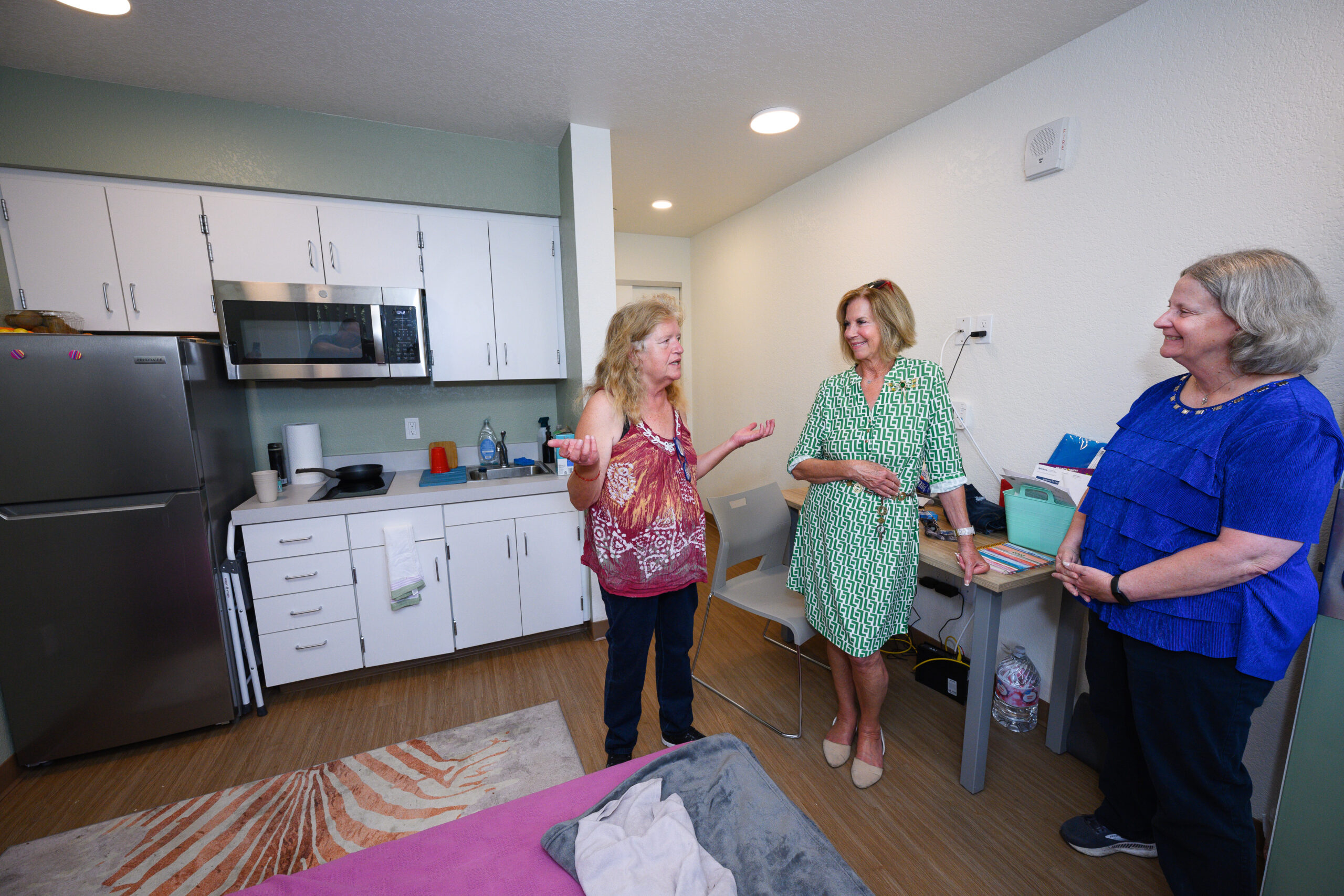 Supervisor Hahn and Whittier First Friends Church Pastor Loletta Barrett speak with Angela, one of the new residents at Laurel Grove.