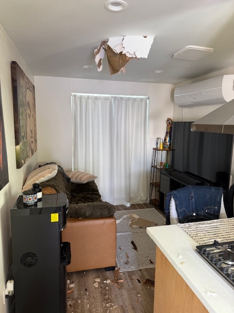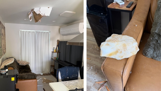 The incident happened Friday, April 10, 2026 at around 11:15 am when resident Yuder Grau heard what sounded like an explosion. He found that a large block of what appeared to be dirty ice had crashed through the ceiling and into the living room, landing on the couch. Luckily, no one was harmed.